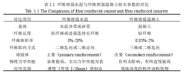 随着当代建筑科学技术的革新,致力于混凝土性能改进研究中的国内外专家发现,在混凝土中掺加纤维是一种重要的解决途径,能有效弥补混凝土的缺点并扩大其应用范围,纤维混凝土顺势成为眼下的研究热点。 纤维水泥基复合材料(fiber reinforced cement-based composite)是以水泥浆、砂浆或混凝土为基体,掺入金属纤维、无机非金属纤维、聚丙烯纤维或天然有机纤维做为增强组分的一种新型复合材料。因其基体不同可分为纤维增强水泥(fiber reinforced cement)和纤维增强混凝土。两者的不同处列于表 1.1。在纤维掺量适当时,纤维与基体均匀拌合后,相比普通混凝土,FRC 主要有两方面特点: