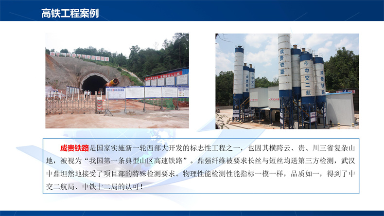 截至2021年底,中国铁路营业里程达到15万公里、高速铁路达到4万公里,公路总里程达到528万公里、高速公路里程达到16.9万公里。在狂魔基建的大背景下,武汉市中鼎经济有限责任公司的鼎强聚丙烯纤维、纤维素纤维、聚丙烯网状纤维、聚丙烯腈纤维,镀铜微丝钢纤维应用到国家重点工程----深圳盐田港工程,哈大、京沪、成渝等高铁工程,南京纬三路隧道工程,西藏机场建设工程,珠海横琴交通枢纽工程,还有援外的中马友谊大桥,非洲维尔纳小学等。