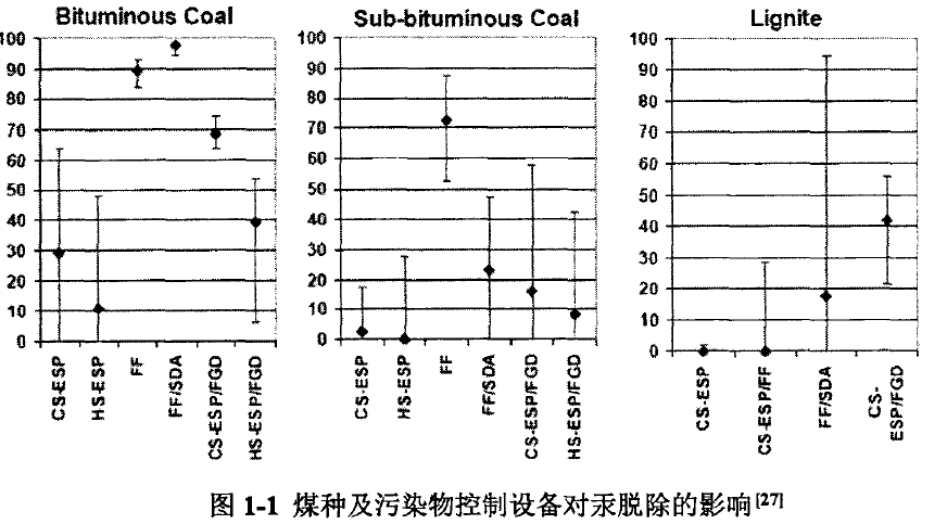 大气环境中的汞污染是全球性问题,已在世界范围内引起了广泛关注。煤在燃烧过程中,汞受热主要以汞蒸气的形态存在,主要包括单质汞,二价汞和颗粒态汞,其中单质汞是汞的热力稳定形态。大部分汞的化合物在温度为°时将受热分解成单质汞。而二价汞化合物比较稳定,易被湿法洗涤系