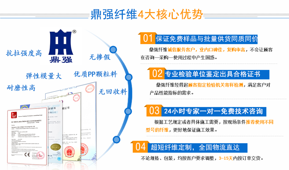 武汉市中鼎经济发展有限责任公司一直致力于研究纤维在工程中的应用。公司与高校研发人员时时关注国内纤维发展动向,不断开发新的产品投放市场。鼎强纤维现分为3大类,20多个小类,具有良好的防裂、防渗、抗拉、抗冻、抗冲击等性能,可广泛用于不同行业,聚丙烯改性纤维、防爆纤维、纤维素纤维等产品质量均为国内一流水平。2012年又研发出新产品——脱硝催化剂纤维,专供国内新型电力环保生产企业。